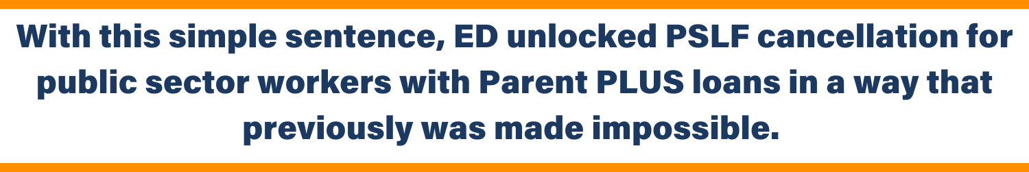 Late last year, ED revised its website to clarify that the application of IDR adjusted credits toward PSLF “will be applied automatically to all PSLF-eligible Direct Loans, including consolidated and unconsolidated Parent PLUS loans.” With this simple sentence, ED unlocked PSLF cancellation for public sector workers with Parent PLUS loans in a way that previously was made impossible.
