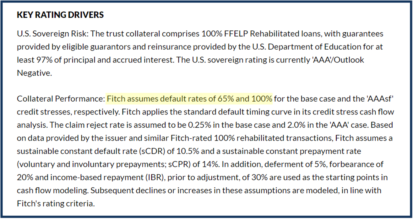 If borrowers were likely to end up making less than their expected payments without defaulting—for example, by entering a deferment or a forbearance, falling delinquent without reaching default, or even by accessing an income-based repayment option that might beneficially lower the borrower’s monthly payments—that could pose a problem for the SLABS, as less cash would come in. But when struggling borrowers are expected to simply default, the companies structuring SLABS can rest assured that they will receive a payout from a GA, eliminating any cashflow concerns.