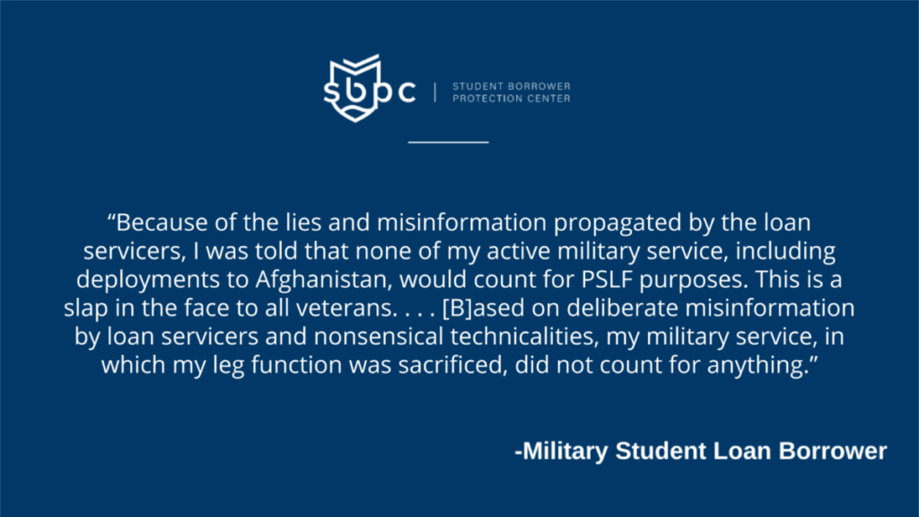 These findings highlight the problems military borrowers face when trying to access PSLF. As documented in a new report from the SBPC, Protecting Military Borrowers: How the Department of Education can restore the promise of Public Service Loan Forgiveness for American servicemembers, military borrowers face obstacles in trying to satisfy each of the requirements of the PSLF program, including having the right type of loan, the right type of employment, the right repayment plan, and the right number of payments. One military borrower described his hurdles in navigating the many servicing breakdowns he faced in trying to earn PSLF: