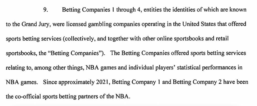 We know that the “co-official sports betting partners” of the NBA are online sports betting giants FanDuel and DraftKings—the tech companies driving the boom in online sports betting and the proliferation of so-called propositions or “prop bets.” Prop bets can include the performance of individual players—offering bettors the chance to make bets not just on the outcome of a game, but betting repeatedly throughout a single game on dozens of player stats, team stats, overall score predictions, and more. Easy access to online prop betting underpins the illegal gambling scheme at the center of “Operation Nothing But Bet.”