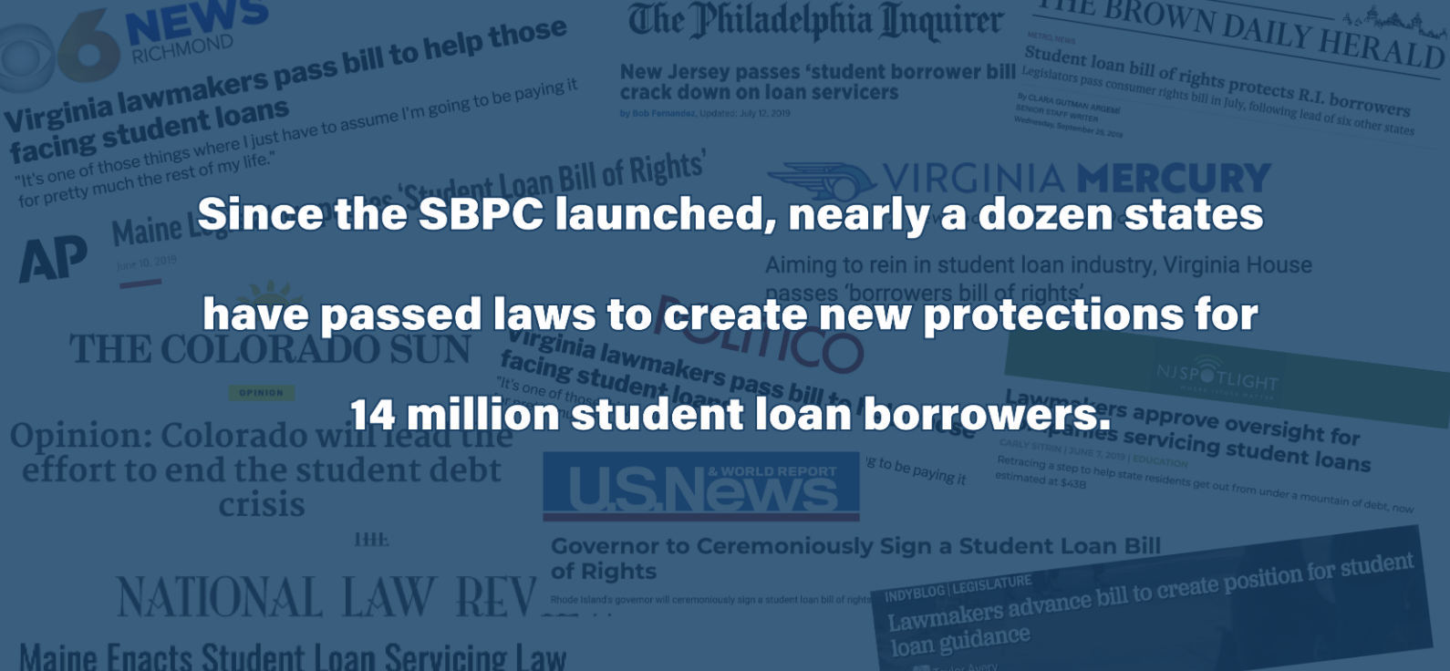 The SBPC is proud to be part of a growing movement of advocates reaching from coast to coast — consumer groups, grassroots organizers, labor organizations, elected officials, law enforcement, and regulators — who have thoughtfully and tenaciously taken critical steps to stand up for the millions of Americans with student loan debt.